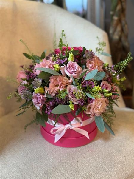 A beautiful seasonal selection of flowers arranged in a hatbox. This arrangement is in floral foam so its ready to be enjoyed as soon as it arrives. Hatbox colour may vary.