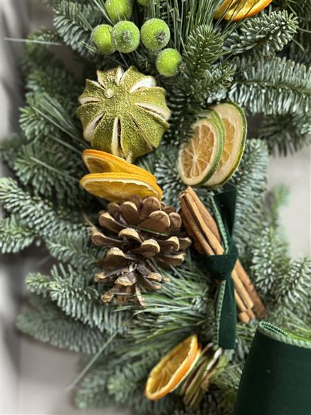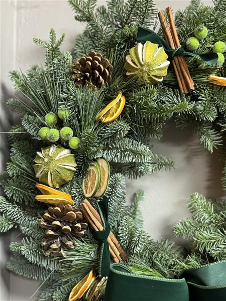 Make a real impression this year with one of our gorgeous HANDMADE Christmas Door Wreath. Mint Velvet, a stunning forest green velvet ribbon, whole limes, oranges and pinecones.