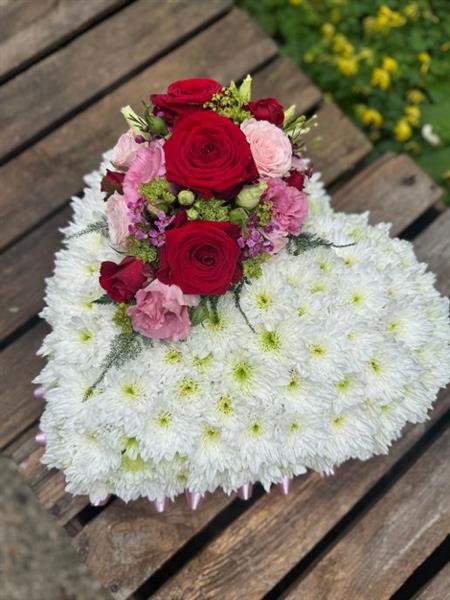 A pretty red and pink based heart. Beautiful Red roses and pink Lisianthus.