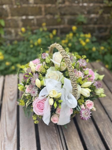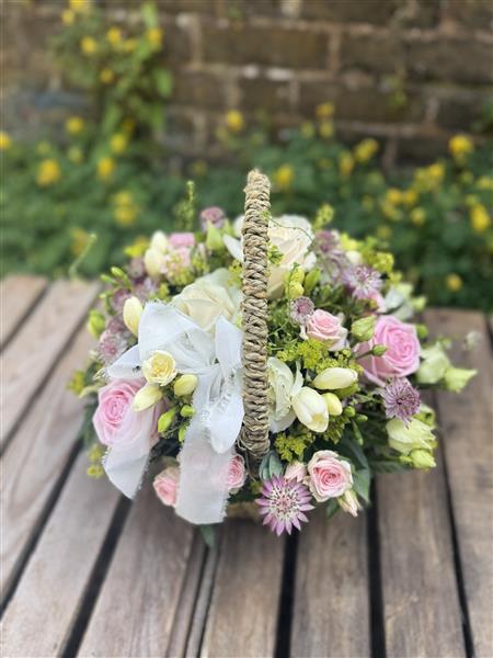 Pretty Pink and White basket. A beautiful selection of seasonal blooms. Perfect to say Happy Birthday or Thank you. Our basket arrangements are in floral foam, which means they are ready to enjoy as soon as they arrive.