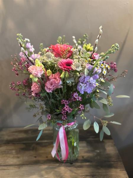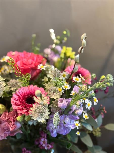 A beautiful seasonal selection of flowers delivered in a vase, ready to enjoy as soon as it arrives. Flowers in image are 'grand'.