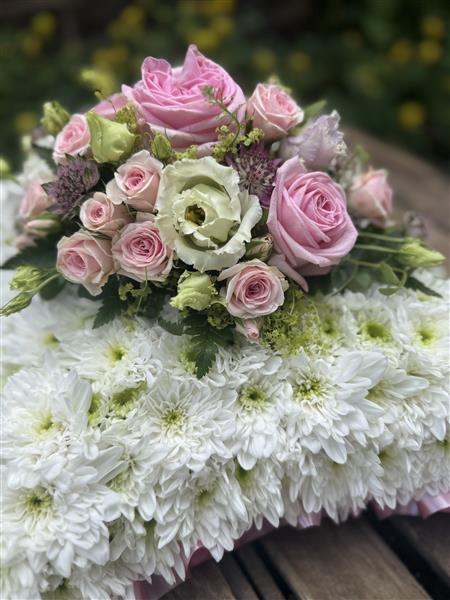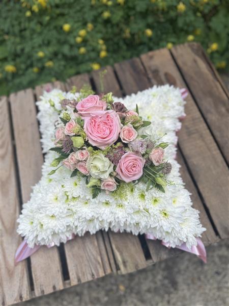 A pretty based cushion, with a soft pink spray and ribbon to complement. Image shows a 14'' cushion
