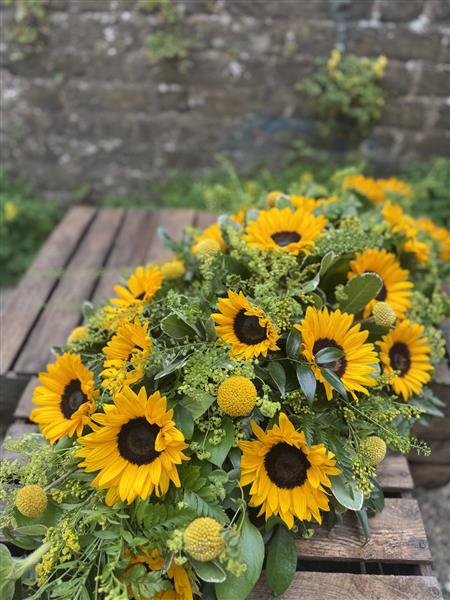 A beautiful Sunflower Casket Spray. Standard design is a 3 ft. Image shows a 5ft spray.