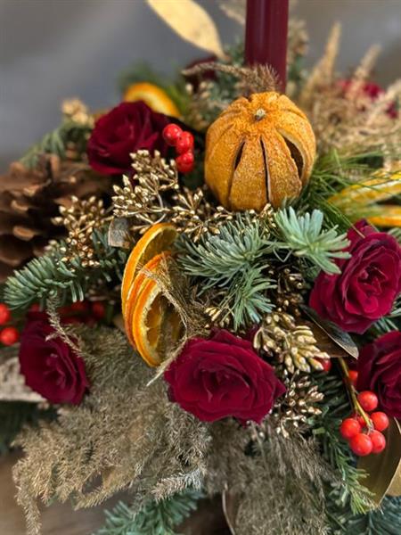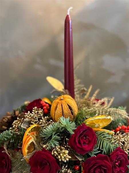 A traditional Christmas table arrangement featuring one taper candle. The centrepiece includes a lush mix of seasonal flowers such as red Roses and winter berries, combined with classic Christmas foliage's like holly, spruce, pine, and eucalyptus. Accents of dried orange slices, cinnamon sticks, and pine cones are artfully woven throughout.