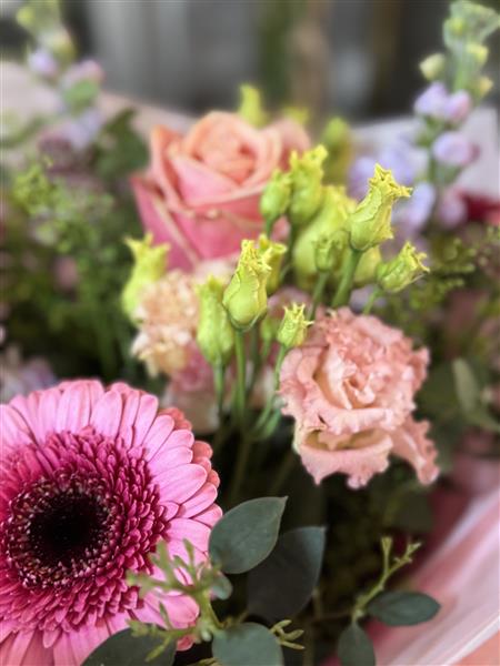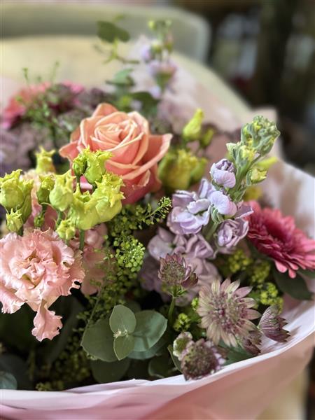 A pretty winter pastel bouquet. Seasonal blooms for a perfect winter treat. Image shows a standard bouquet.